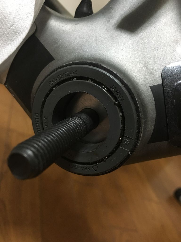 構造としては緑の六角穴付きボルトをくるくる回して行くと左の青椀と黄色いパーツに挟まれた灰色のプレスフィットがBBシェル(紫)外に押し出されるというとても簡単な構造。