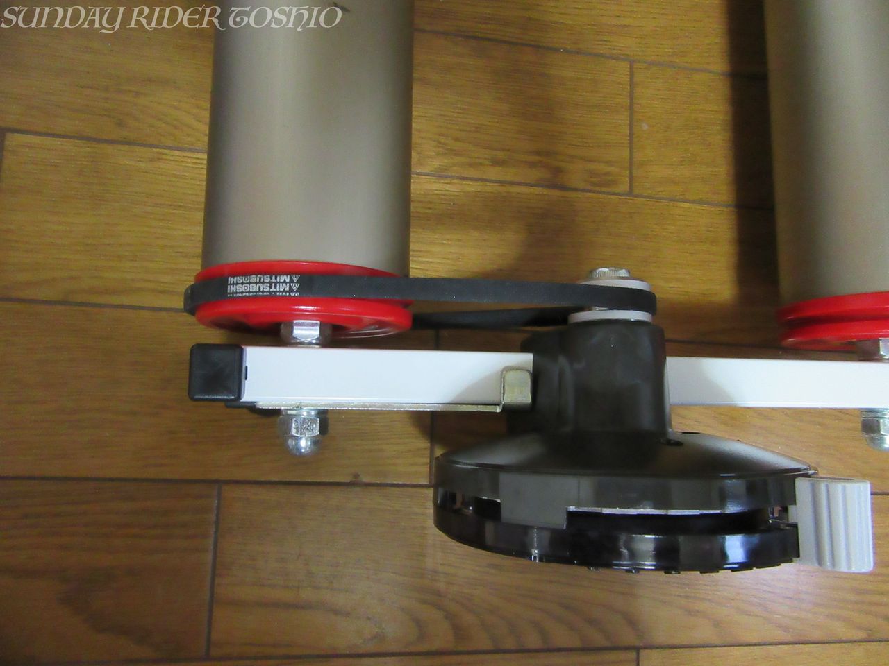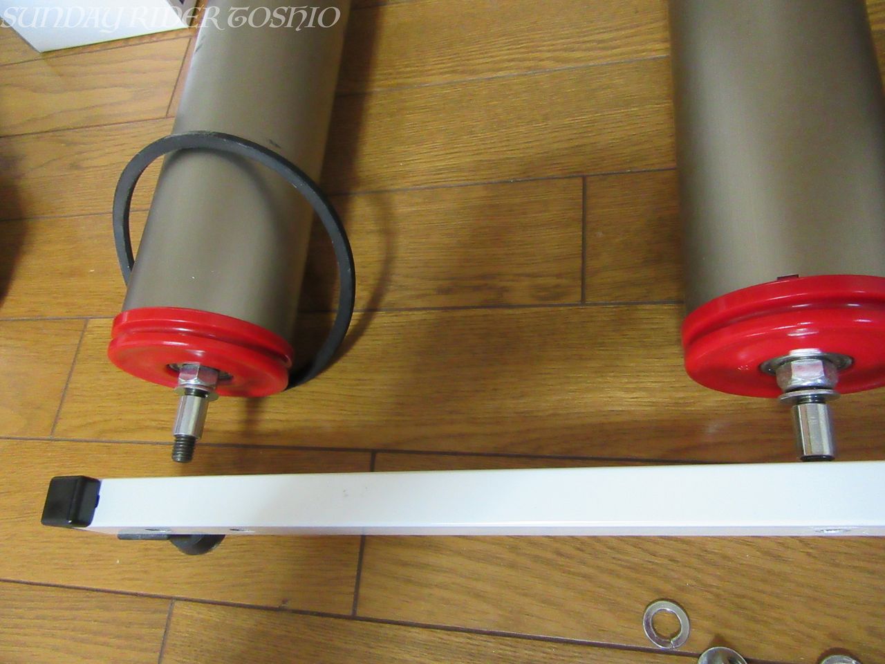 片方のレールから後輪ののっかるローラを外します。次に外側のローラーに負荷ユニットのベルトを通します。